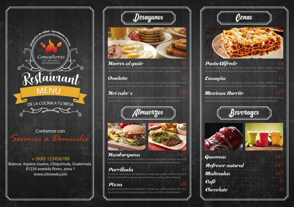 - Cantidad de Platos y Categorías: Un menú con cien platos y diez categorías es más laborioso de organizar y diseñar que uno con veinte platillos.