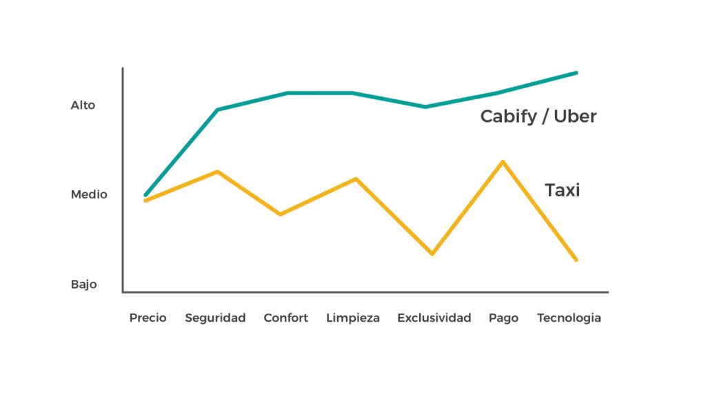 La curva de valor se representa gráficamente: en un eje horizontal se muestran los atributos o factores clave que los clientes consideran importantes al elegir un producto o servicio (por ejemplo, precio, calidad, velocidad del servicio, ambiente, innovación). En el eje vertical, se representa el nivel de valor que se entrega en cada uno de esos atributos. Al analizar tu curva en comparación con la de tus competidores, puedes identificar áreas donde sobresales, donde te quedas atrás y, crucialmente, donde puedes crear una propuesta de valor única que satisfaga las necesidades y preferencias de los clientes de una manera diferente. Ayuda a las empresas a comprender dónde pueden innovar y enfocar sus esfuerzos para obtener una ventaja competitiva significativa.