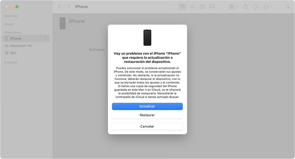 - Seleccionar tu iPhone en la barra lateral (Finder) o en la interfaz del programa.