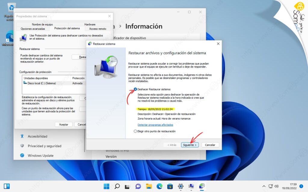 - En la ventana de Restaurar sistema, selecciona la opción Deshacer Restauración del Sistema. Verás los detalles de la restauración que se va a deshacer, incluyendo la fecha y hora en que ocurrió. Haz clic en Siguiente.