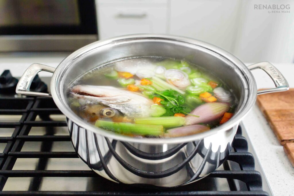 - Añadir pescado y agua: Incorporar las espinas y cabezas de pescado. Cubrir con agua fría.