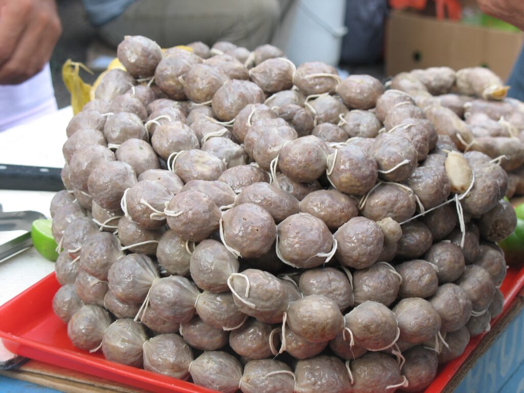 El proceso de elaboración es artesanal y meticuloso. La carne, ya cortada en trozos, se somete a un primer hervor. Posteriormente, esta mezcla es embutida en tripas naturales, que se atan con hilo en secciones para formar esas pequeñas bolitas que son tan famosas. Una vez embutidas, las butifarras se hierven nuevamente hasta alcanzar su punto óptimo de cocción, logrando una textura jugosa por dentro y una piel firme por fuera. Este método de cocción es crucial para su sabor y consistencia.
