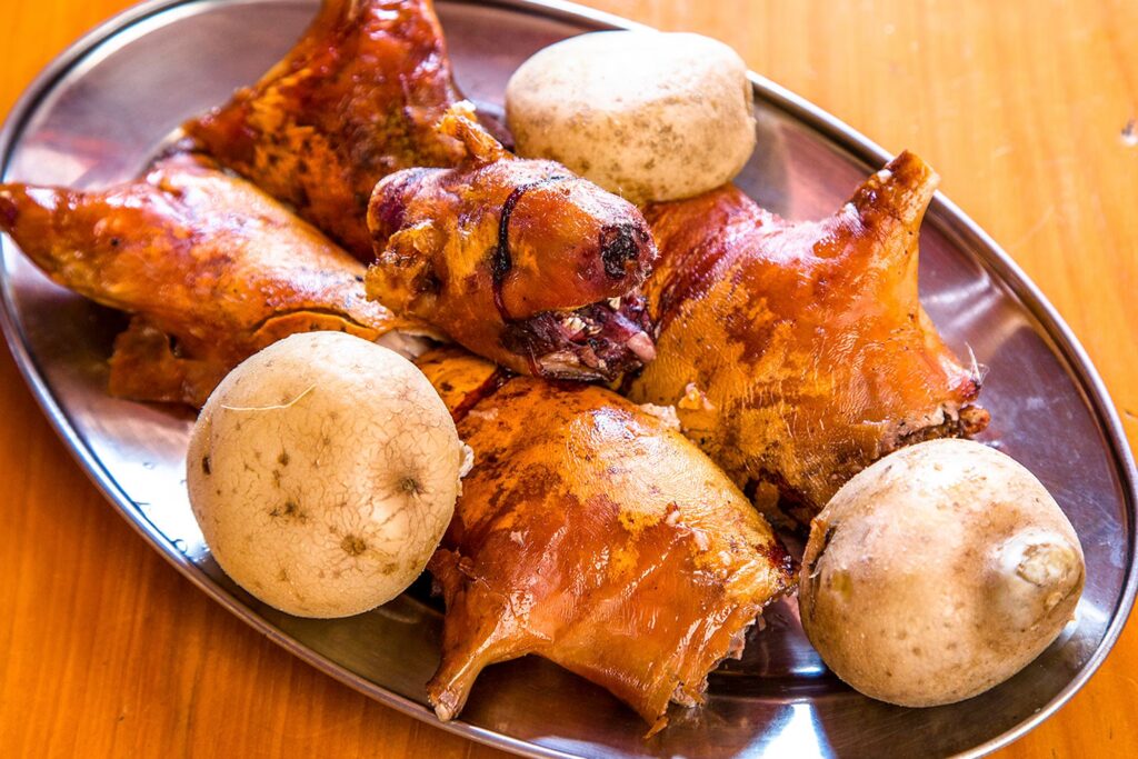 - Cuy asado: El plato más emblemático de Nariño y una experiencia culinaria ineludible. El cuy, o conejillo de indias, se asa lentamente a la brasa hasta que su piel queda crujiente y su carne tierna y jugosa. Se sirve típicamente con papas, maíz tostado y el infaltable ají de maní. Representa una conexión profunda con las raíces indígenas de la región andina.