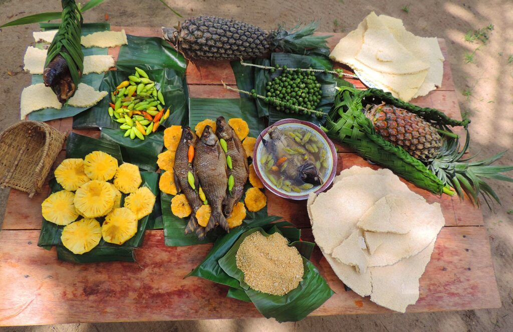Aunque el mañoco y el casabe son los pilares, la dieta de Guainía es rica y variada. Dada su ubicación fluvial, el pescado de río (como la cachama, el pirarucú o el payara) es un acompañamiento fundamental. También se consumen carnes de monte, una amplia variedad de frutos silvestres (como el copoazú, el arazá y el moriche) y otros productos cultivados en la chagra (huerto tradicional indígena). El ají o picantes a base de ají fermentado (como el ajicero) suelen ser un complemento importante para realzar los sabores.