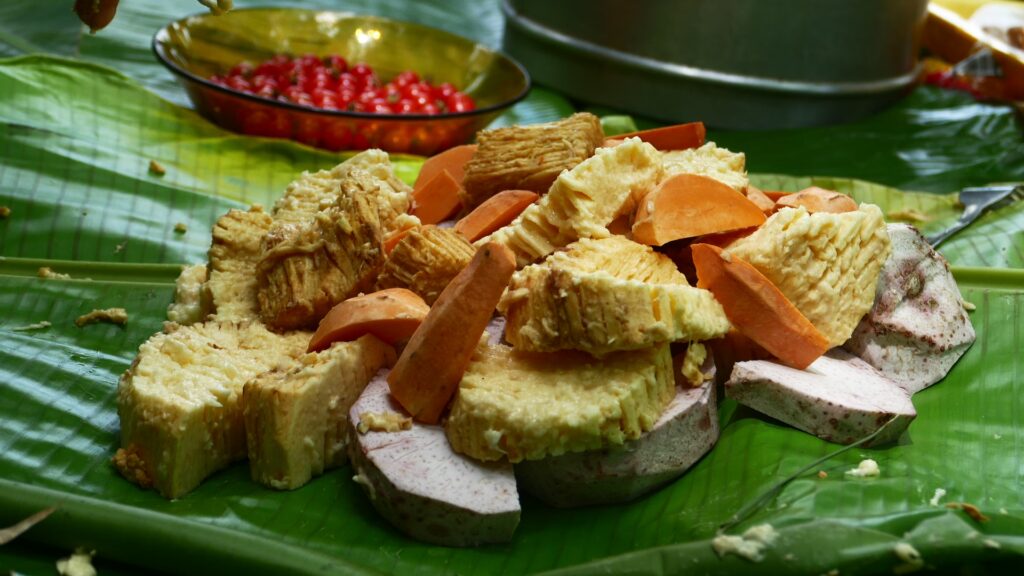 | Bougna | Guiso tradicional cocinado en hojas de plátano bajo tierra. | Ñame, taro, batata, pollo/pescado/marisco, leche de coco. | Ahumeado, cremoso, terroso. |