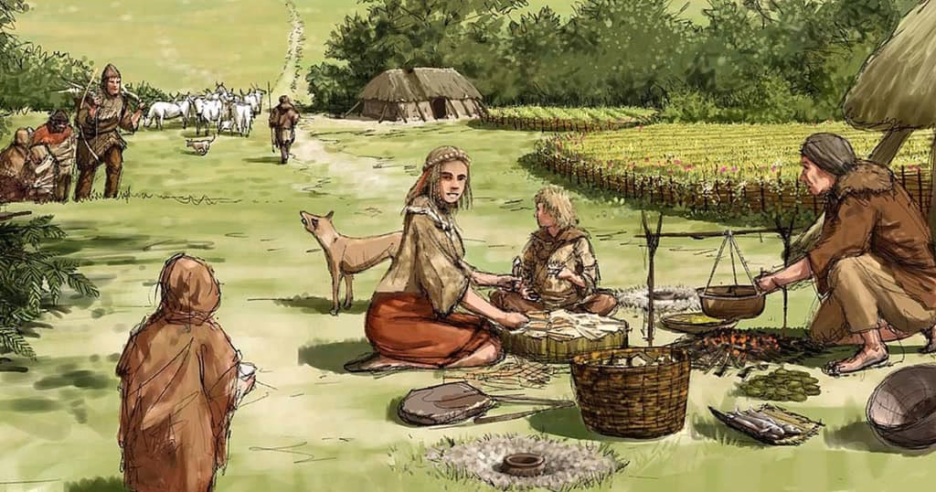 Aunque la caza, la pesca y la recolección seguían siendo importantes, la introducción de la agricultura y la ganadería marcó un cambio revolucionario en el estilo de vida y la alimentación. Se cultivaron los primeros cereales como cebada, espelta y trigo einkorn, así como guisantes, lentejas y lino. Los primeros animales domesticados fueron vacas, cerdos, cabras y ovejas, que proporcionaban carne, pero también materias primas como cuernos, pieles y leche. Las cosechas se almacenaban, y la comida se cocinaba, asaba y horneaba sobre fuego abierto. Se han encontrado evidencias arqueológicas de hornos de pan y vasijas utilizadas como parrillas.