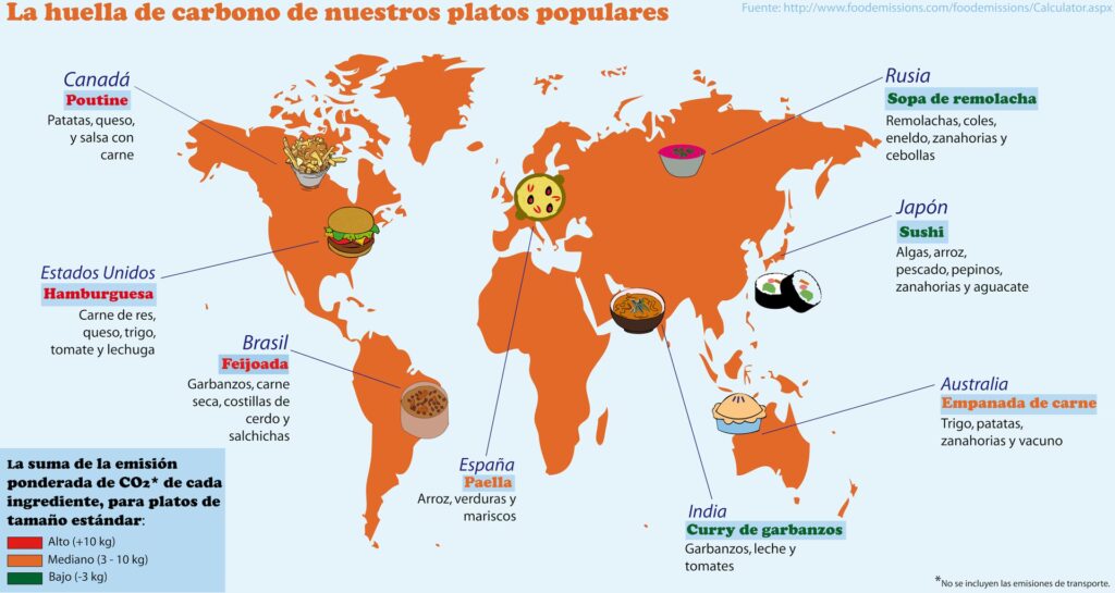 Basándonos en las cifras de emisión por cada 100 gramos de alimento, los 10 alimentos con mayor huella de carbono son: Carne de res (70.6 kg CO2e), Cordero (39.7 kg CO2e), Mariscos (silvestres) (26.9 kg CO2e), Queso (23.9 kg CO2e), Pescado (de piscifactoría) (13.6 kg CO2e), Cerdo (12.3 kg CO2e), Aves de corral (9.9 kg CO2e), Huevos (4.7 kg CO2e), Arroz y cereales (3.6 kg CO2e), y Leche (3.2 kg CO2e).