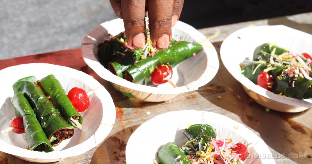 - Hoja de Betel: La hoja de la planta de betel, que no produce fruto, es el envoltorio principal de la mezcla.