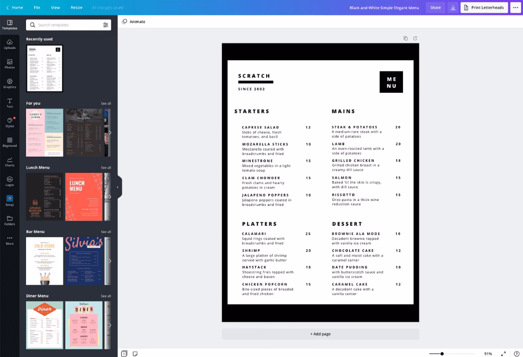 - Canva: Probablemente la herramienta más popular. Ofrece miles de plantillas para menús, una interfaz de arrastrar y soltar, y acceso a una gran cantidad de elementos gráficos, fotos y fuentes.