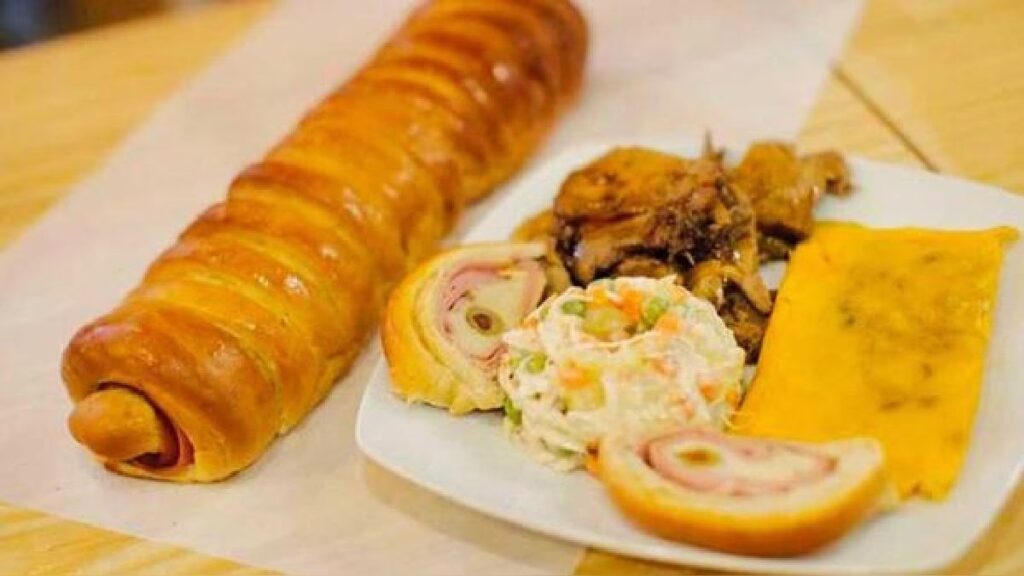 | Pan de Jamón | Pan dulce relleno de jamón, aceitunas y pasas. | Harina de trigo, jamón ahumado, aceitunas rellenas, pasas. | Café, chocolate caliente, ponche crema. |