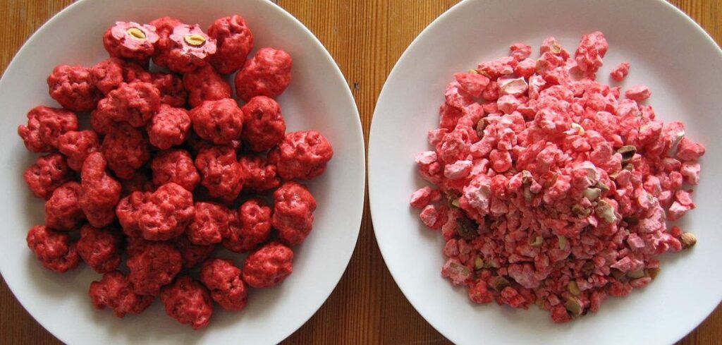 - Pralín (Pralin): Como se mencionó, este término se refiere a los frutos secos caramelizados triturados hasta obtener un polvo o una pasta con pequeños trozos, es decir, menos refinada que el praliné liso.