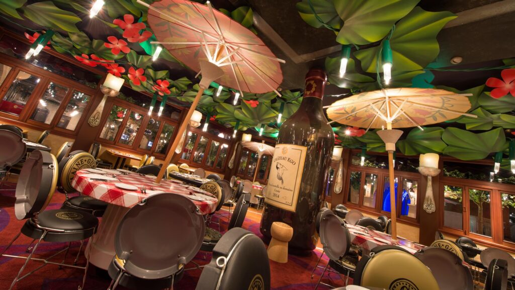 El comedor es un festín para los ojos, con objetos de cocina de tamaño colosal integrados en el mobiliario y la decoración. Cucharas gigantes cuelgan del techo, funcionando como lámparas que iluminan el espacio con un brillo cálido y acogedor. Sombrillas de cóctel adornan las paredes, añadiendo un toque de fantasía tropical, mientras que una cazuela gigantesca cuelga majestuosamente, recordándote que estás en un lugar donde la cocina es la protagonista. Las botellas de vino son más altas que los propios comensales, y si te fijas bien, algunas muestran dos fechas grabadas: 2007, el año del estreno de la película, y 2014, el año en que el Bistrot Chez Rémy abrió sus puertas.