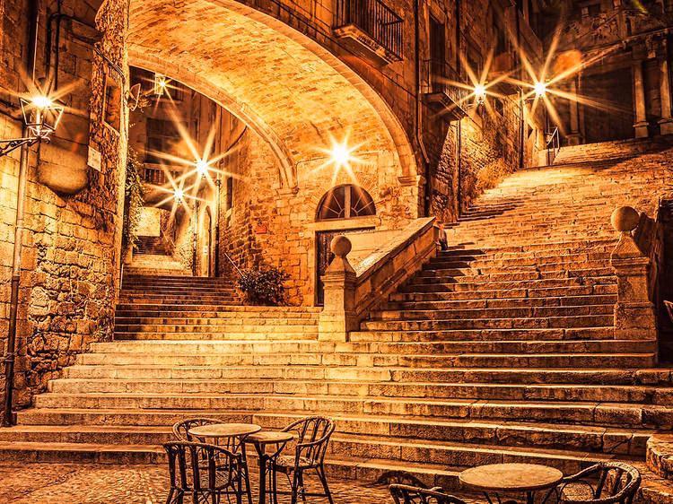 La imponente Catedral de Santa María, con su famosa escalinata de 90 escalones (escenario de "Juego de Tronos"), y los históricos Baños Árabes son paradas obligatorias. Para finalizar el día con vistas panorámicas, un paseo por la Muralla de Girona al atardecer es una experiencia inolvidable.