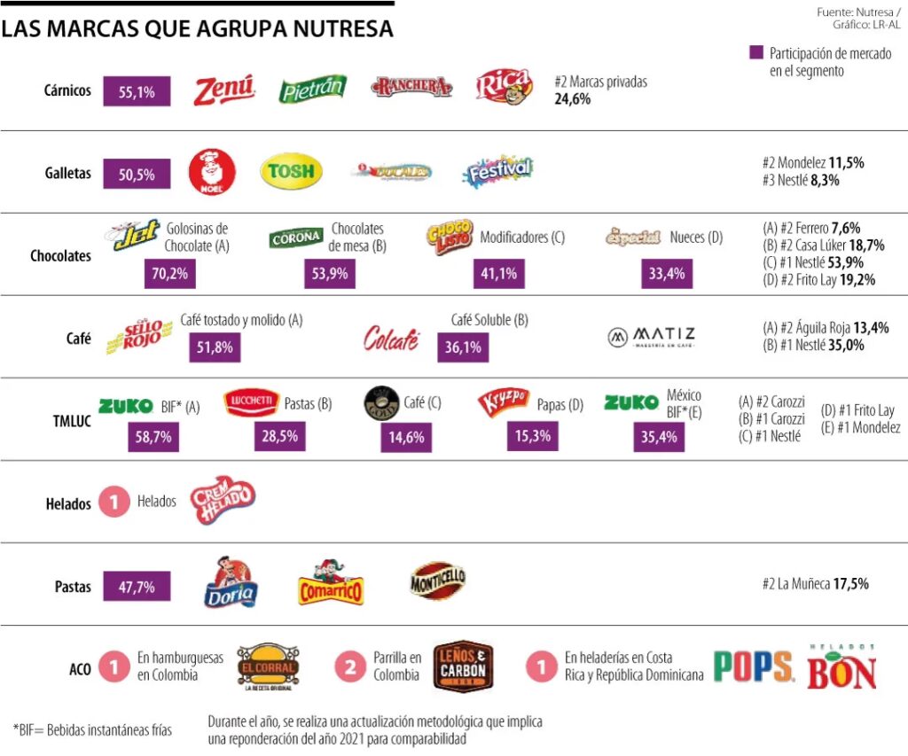 Para el año 2020, Grupo Nutresa celebró sus primeros 100 años de existencia, consolidándose como la compañía de alimentos más importante de Colombia y una de las más relevantes de América Latina. Su presencia directa se extiende a 17 países, con 47 plantas de producción distribuidas por el mundo, y mantiene participaciones de mercado superiores al 50% en los países donde opera.