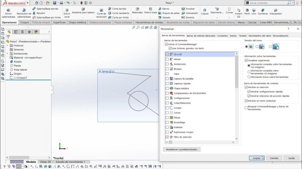 Una vez que hayas restaurado o restablecido tu interfaz, es posible que desees personalizarla nuevamente para adaptarla a tu flujo de trabajo. SOLIDWORKS ofrece amplias opciones de personalización. Dentro del diálogo Personalizar, puedes: