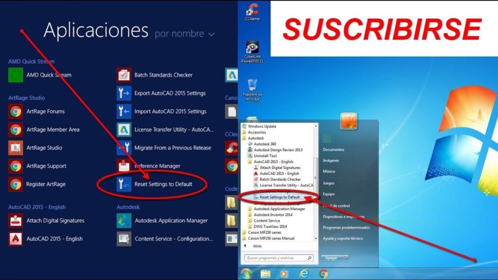 Inicio, luego haz clic enTodas las aplicaciones. Busca la carpeta de tu versión de AutoCAD (por ejemplo,AutoCAD 20xx) y dentro de ella, seleccionaRestablecer configuración predeterminada. - En Windows 10: Ve al menú