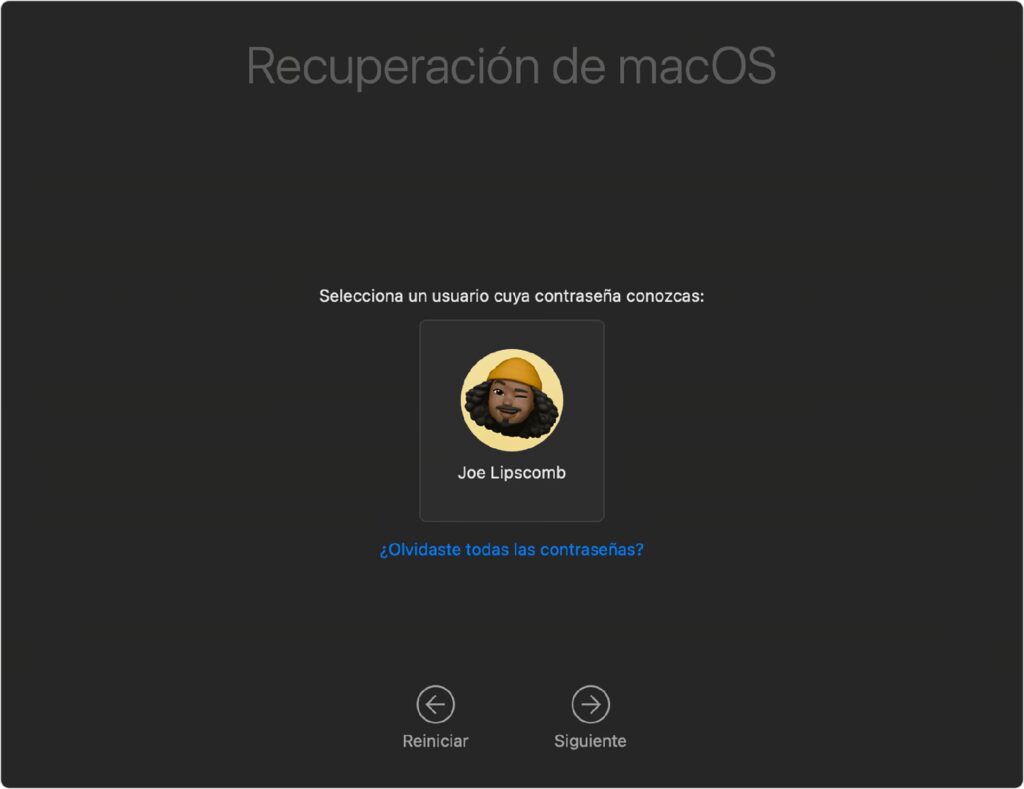 Una vez en el modo de Recuperación, se te pedirá que selecciones un usuario del que conoces la contraseña. Haz clic en “¿Olvidé todas las contraseñas?”. Sigue las instrucciones en pantalla, que pueden incluir pasos para restablecer tu contraseña. Una vez hecho, haz clic en “Salir a Recuperación”. Si se te pidió restablecer tu contraseña, ahora puedes ir al menú Apple () > Reiniciar y usar tu nueva contraseña.