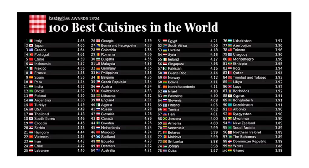 - Taste Atlas es una consultora croata que se especializa en la gastronomía global. Elabora sus rankings y mapas interactivos mediante la recopilación de reseñas y calificaciones de expertos y viajeros de todo el mundo, identificando y valorando los platos tradicionales de cada país.
