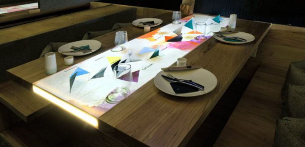 La inmersión comienza desde el momento en que los comensales se sientan. En Sapiens, la mesa principal, una estructura redonda con capacidad para ocho personas, cobra vida propia. Su nombre es Eva, una inteligencia artificial con voz y personalidad, que, según la narrativa del restaurante, se ha escapado de una ciudad tecnológica y ha sido capturada por Adam, un humano excéntrico que reside en el restaurante y sueña con salvar el mundo. Eva, 'atrapada' en esta mesa, proyecta imágenes y su voz narra una historia mientras los comensales interactúan con ella y con Adam, sumergiéndose en un menú degustación de nueve tiempos.